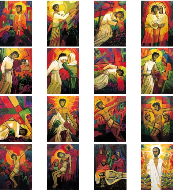Sixteen Stations of the Cross. These inspired illustrations of Christ's journey to the Cross and beyond are presented to us through colour and symbol.